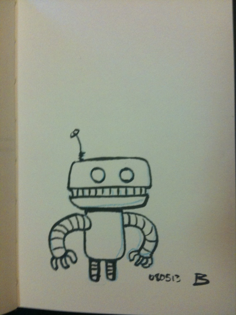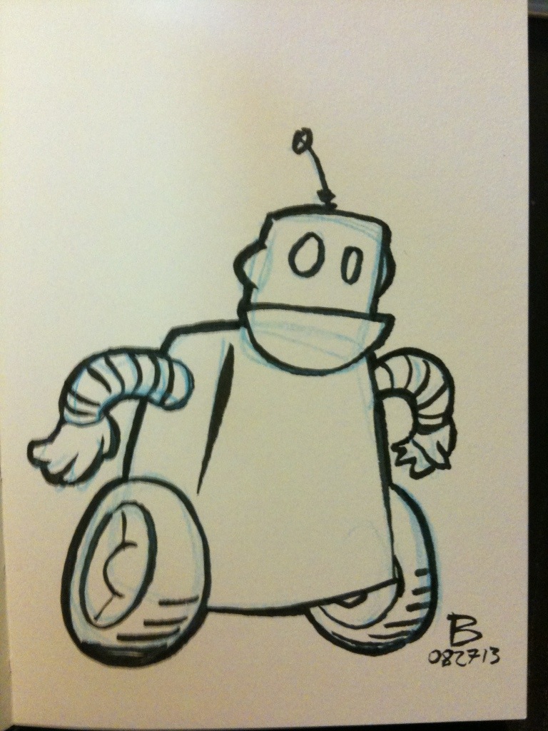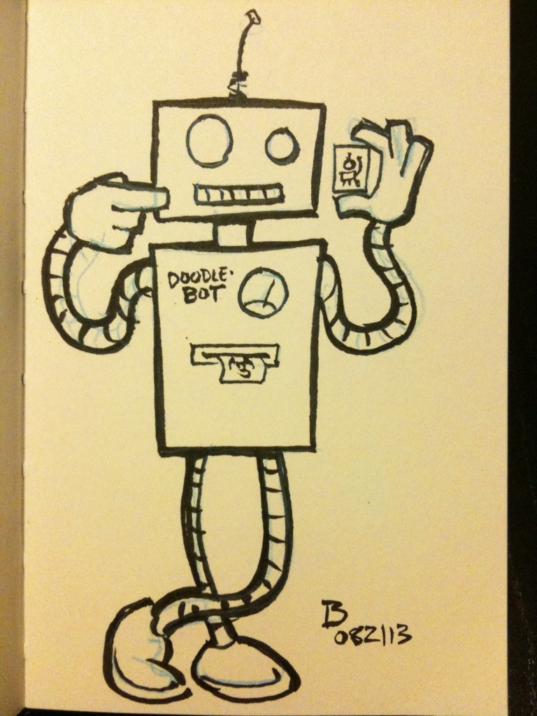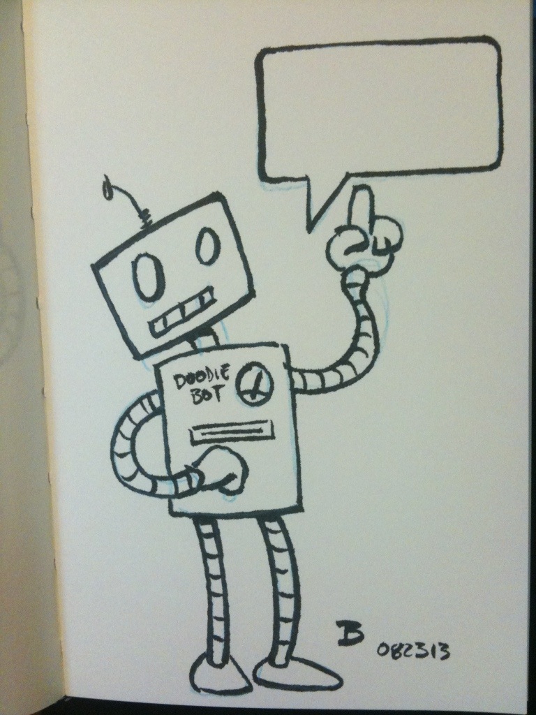 Win an original robot sketch card! Leave a comment telling us who your favorite robot is from movies, comics, wherever. Then on Friday, August 23, we’ll select five (utilizing a highly complex robotic random selection algorithm) to receive an original robot doodle on an “Artist Trading Card.” How about that, puny hu-mans? Beepboop!