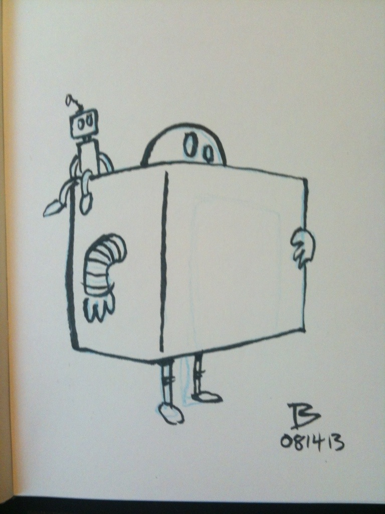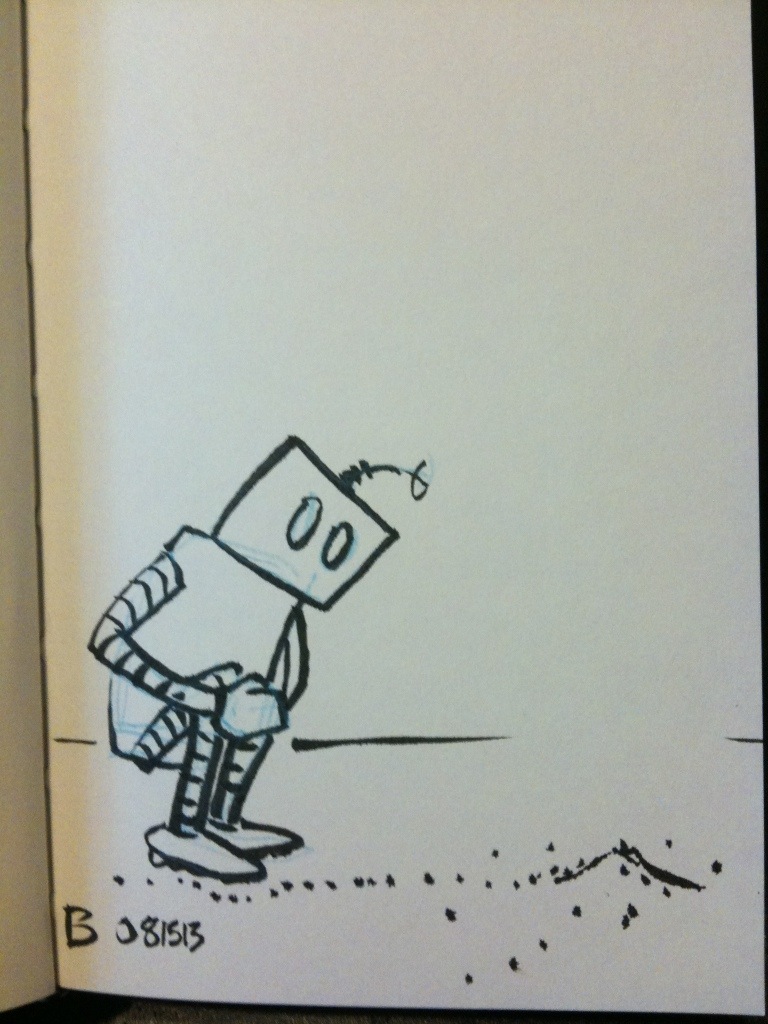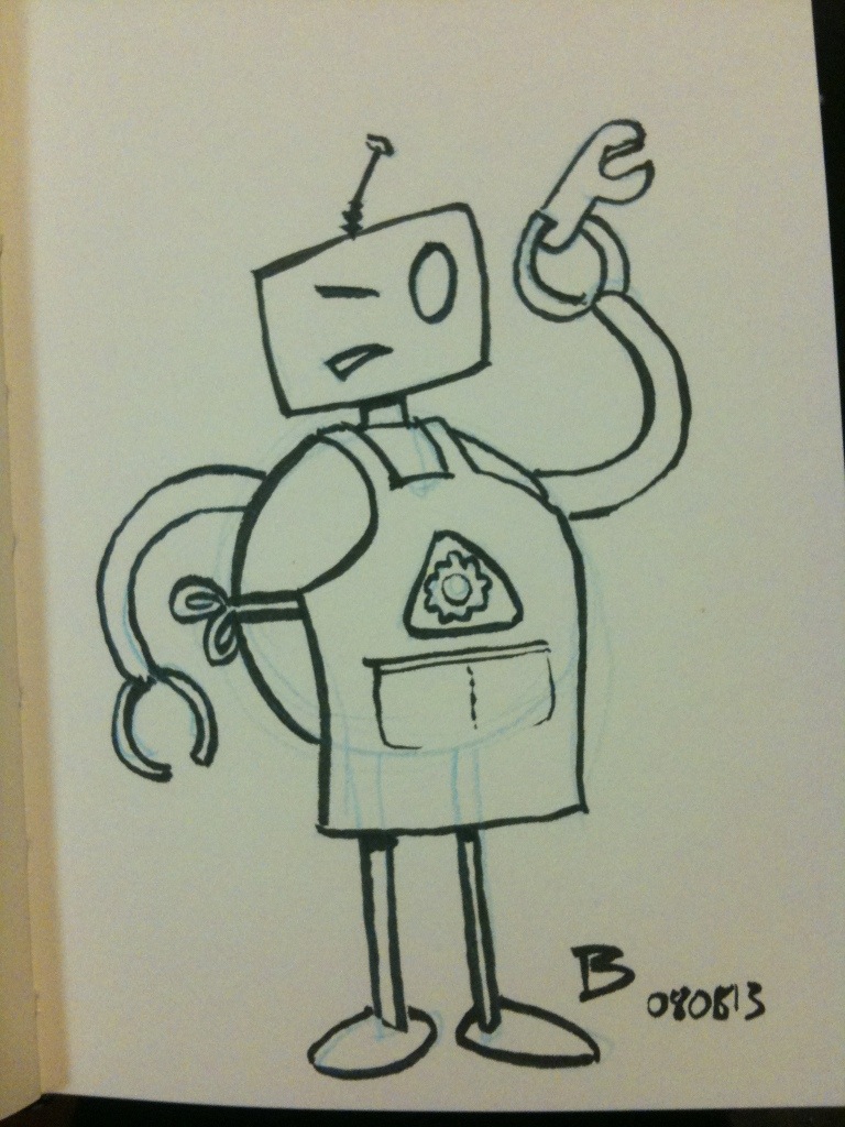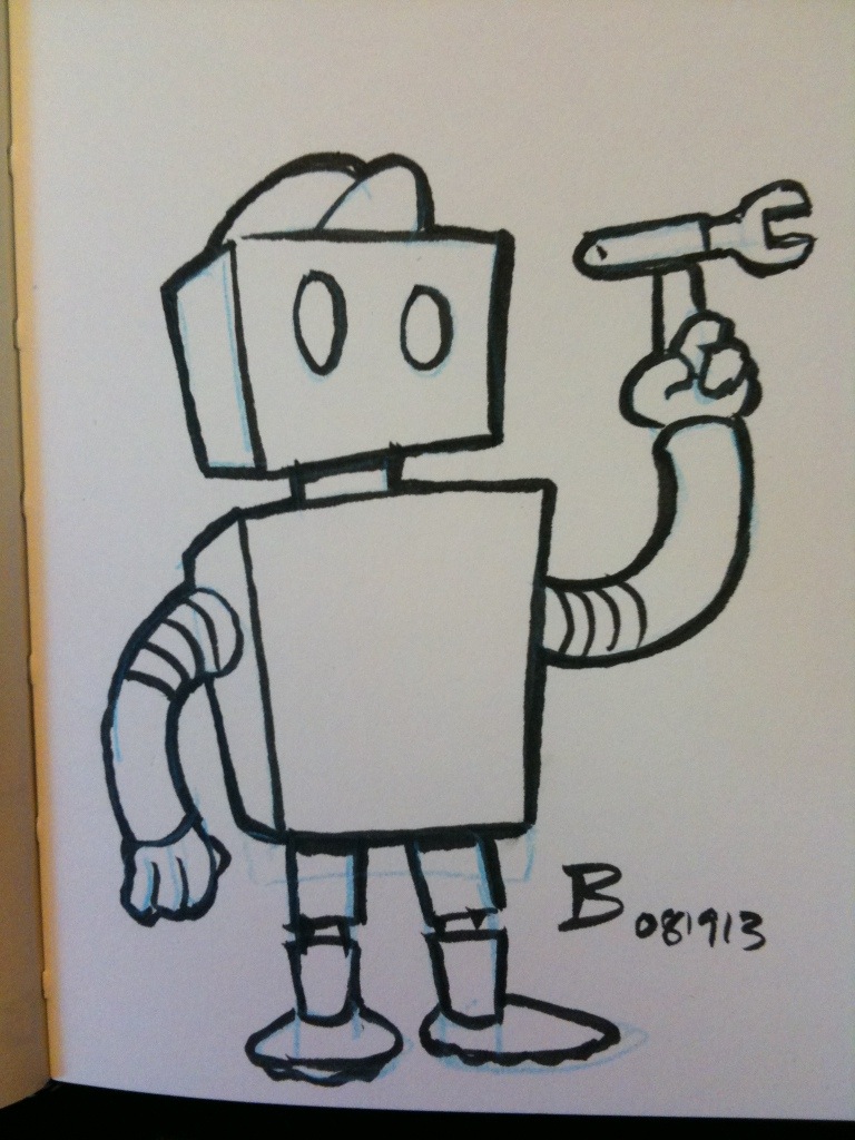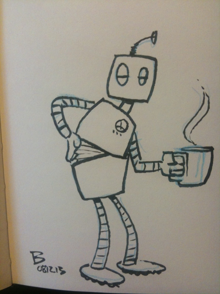 Win an original robot sketch card! Leave a comment telling us who your favorite robot is from movies, comics, wherever. Then on Friday, August 23, we’ll select five (utilizing a highly complex robotic random selection algorithm) to receive an original robot doodle on an “Artist Trading Card.” How about that, puny hu-mans? Beepboop!
