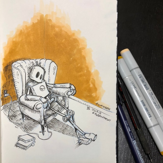 <Low voltage alert— batteries nearly exhausted> After gathering a couple of books and plugging in to an electrical outlet, the robot plopped down in a favorite chair to read for a couple of hours.