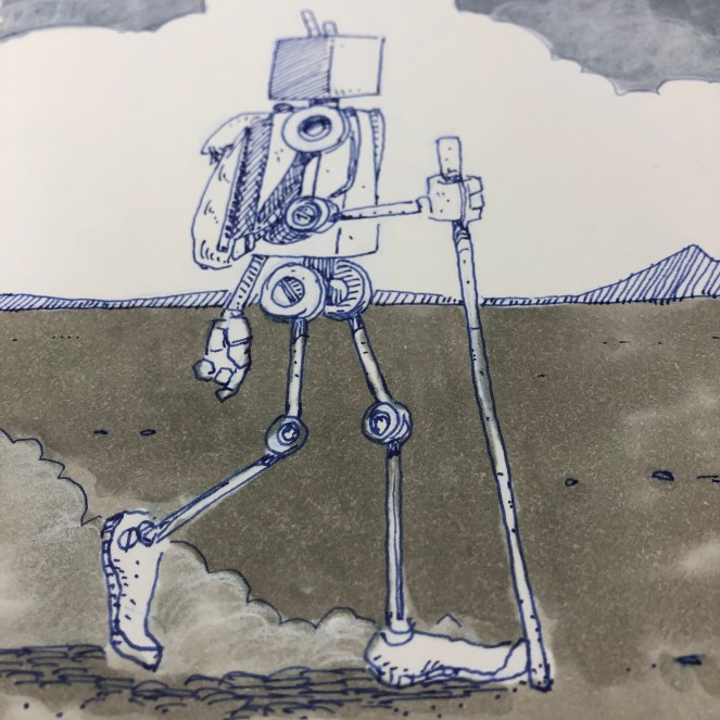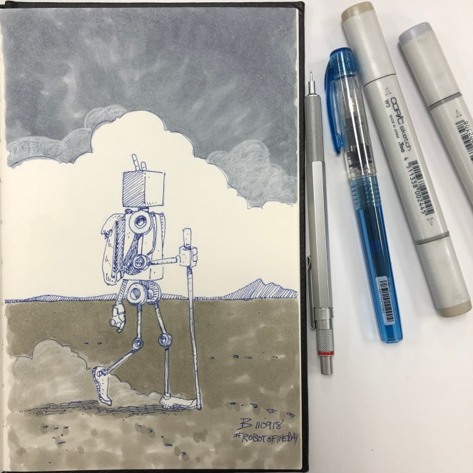 Our favorite human made a quick sketch during his lunch break. He says it was inspired by the illustrative style of Moebius. He also wanted to take a break from Inktober and try out his new Platinum Preppy fountain pen. He rather liked it as a drawing instrument.