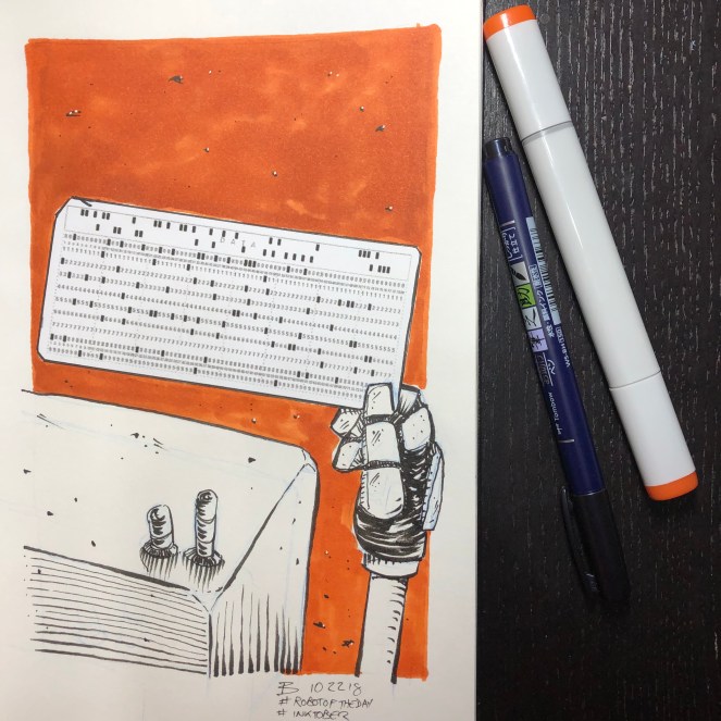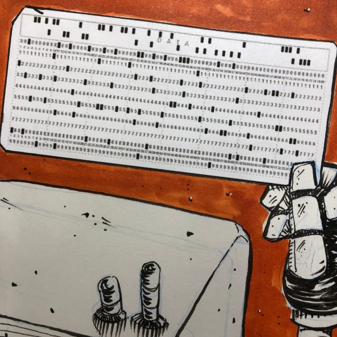 The robot returned its attention to the punchcard, switching optics to 2x mag. The printing on the card had faded a little; the bottle had provided protection against moisture, but not against the sun. There appeared to be 80 columns, with rows numbered one through nine. After a moment’s calculation, the robot determined that an attempt at decoding could be expensive in terms of power: all cores would be utilized which meant increased heat generation. More heat meant more fans, which meant an increased drain on batteries. A decoding attempt would have to until help was available.