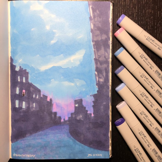 The sun had set some time ago and all that was left was a lingering blue light refracting through the atmosphere. I paused for a moment in a bubble of quietude, noting that I had an observer. The robot did not move, and continued to watch as I continued on my way up the street.