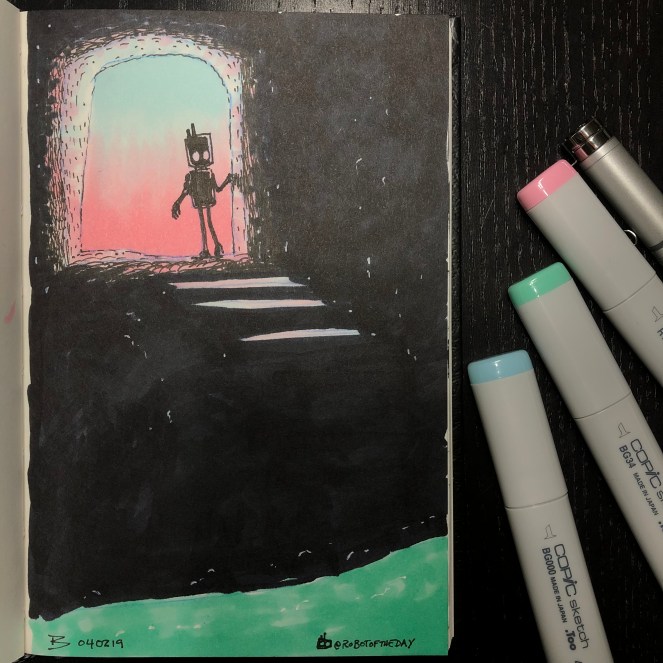 The other day I was sitting with a group of robots when one of them told me a story: while exploring/mapping a remote location the robot encountered a passageway to a subterranean space. The robot related that the space was difficult to measure as IR provided no useful information and there was a high level of EMF noise. So noisy, in fact that the robot was forced to leave as the RF interference was affecting its own CPU. But it did detect something deep within emanating from the shorter wavelengths of the visible spectrum…