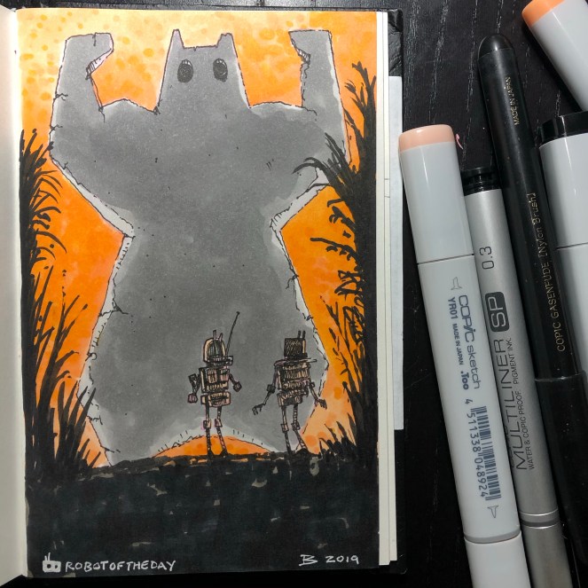 After a servo-torquing side trip through an especially dense wood, the two explorers emerged into a clearing lit with a flickering orange light and dominated by a towering effigy of a feline, its forelegs raised to the sky. “This appears to be feline,” remarked one robot to the other. “How must this relate to the cats that frequent our dwellings?”