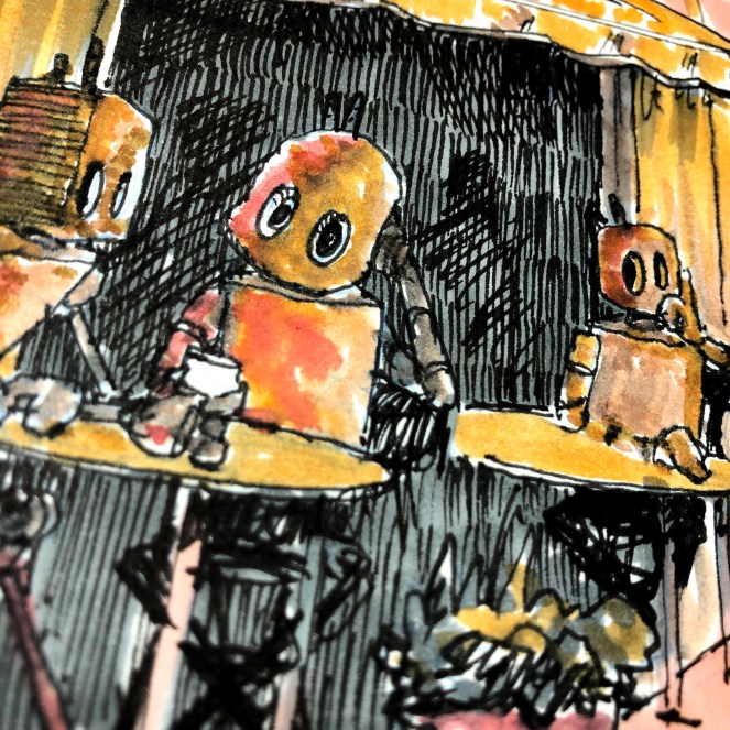 Robots Robots of the Day: February 18 April 29, 2020 RobotOfTheDay2 Comments “Rechargé life.” Quick sketch of a street scene, early evening. Worked quickly as the light filtering down to the sidewalk was changing minute by minute. Share this: Click to email a link to a friend (Opens in new window) Email Click to share on Facebook (Opens in new window) Facebook Click to share on X (Opens in new window) X Click to share on Tumblr (Opens in new window) Tumblr Click to share on LinkedIn (Opens in new window) LinkedIn Click to share on Reddit (Opens in new window) Reddit Like Loading... Share this: Click to email a link to a friend (Opens in new window) Email Click to share on Facebook (Opens in new window) Facebook Click to share on X (Opens in new window) X Click to share on Tumblr (Opens in new window) Tumblr Click to share on LinkedIn (Opens in new window) LinkedIn Click to share on Reddit (Opens in new window) Reddit Like Loading...