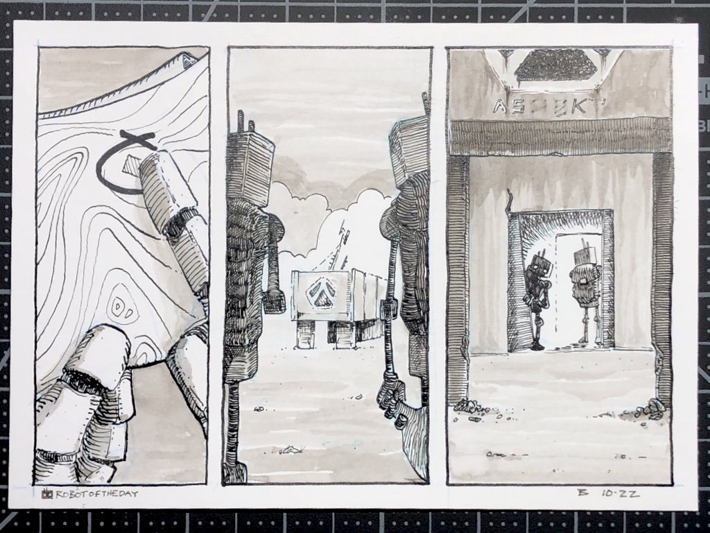 While documenting my life with robots I would occasionally hear stories about desolate, troublesome areas beyond the boundaries of the robots’ knowledge. The nature of these areas seem to confound any attempts at exploration and reliable documentation. Each time I heard these stories I’d ask the storyteller to take me out to the Unmapped Area so that I could witness with my own senses. But the robots were either unwilling or — more likely — unable to guide me as their own memories were corrupted to some degree by the EM noise that seemed to be present in these wastes far outside where reasonable robots roamed. Eventually I found my guides: Two robots, Feld and Terlo, that had heard of my desire to explore beyond what was known promised to take me out on their next trip. They claimed to be well prepared, and had been to the Fringes, and beyond, several times, and had created an analog map. Their pen-and-paper measure against memory corruption marked the location of a structure they wished to explore.