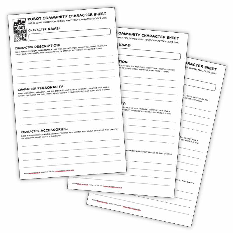 This is the blank character sheet. It’s set up with two to a 8.5×11 page. Print one copy, cut down the middle, and–beepboop!–you have two new character sheets. Now go create some new characters for your robot community!
