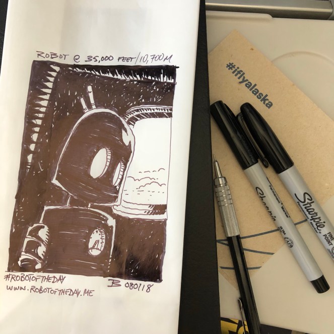 (Art drop at 35,000 feet) The robot sat in the seat next to met, without moving or making a sound, apparently taking a few idle cycles to access random sectors of memory and review their contents. We were both experiencing the movement of electrons across circuits.