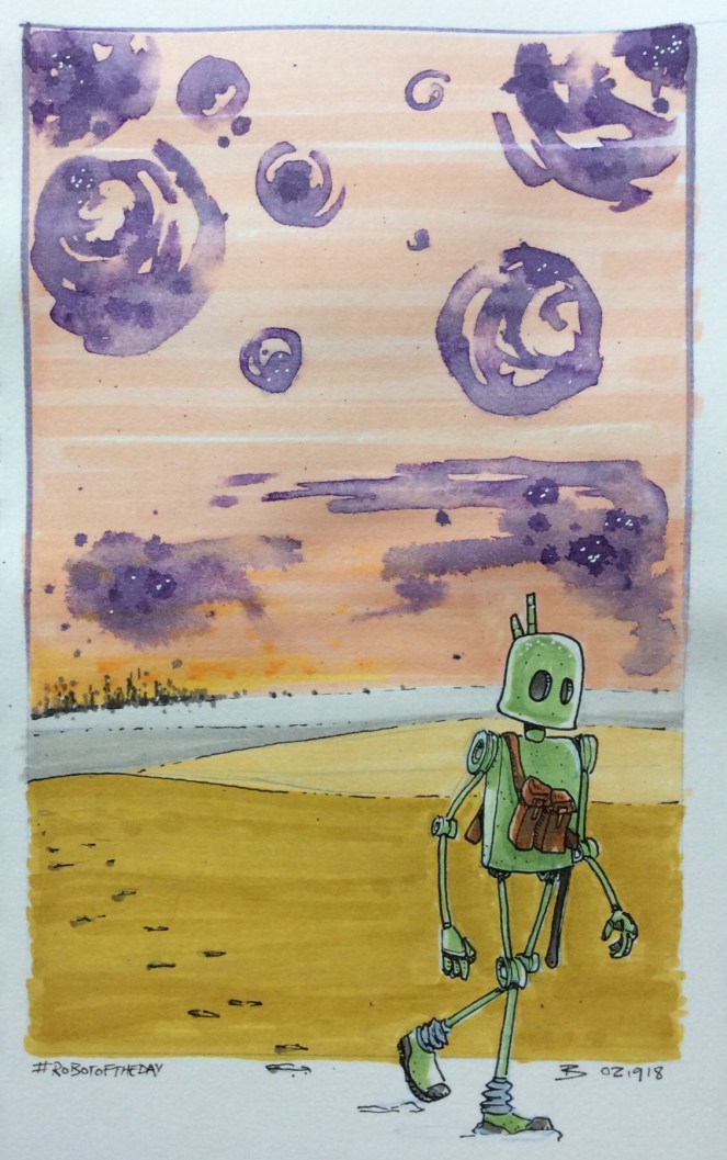 The robots are venturing out of the sketchbook and on to tiny canvases! This is the first step…