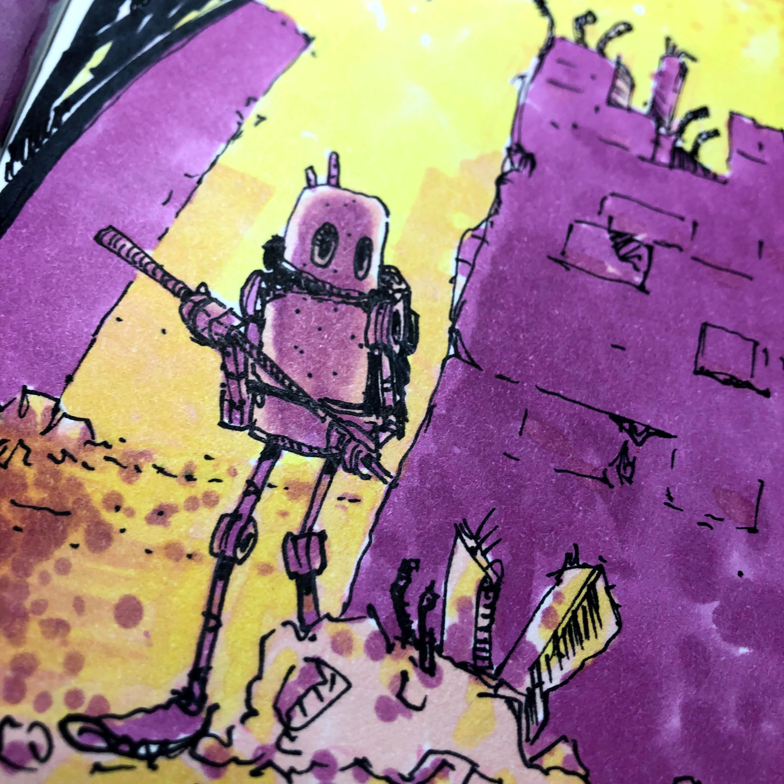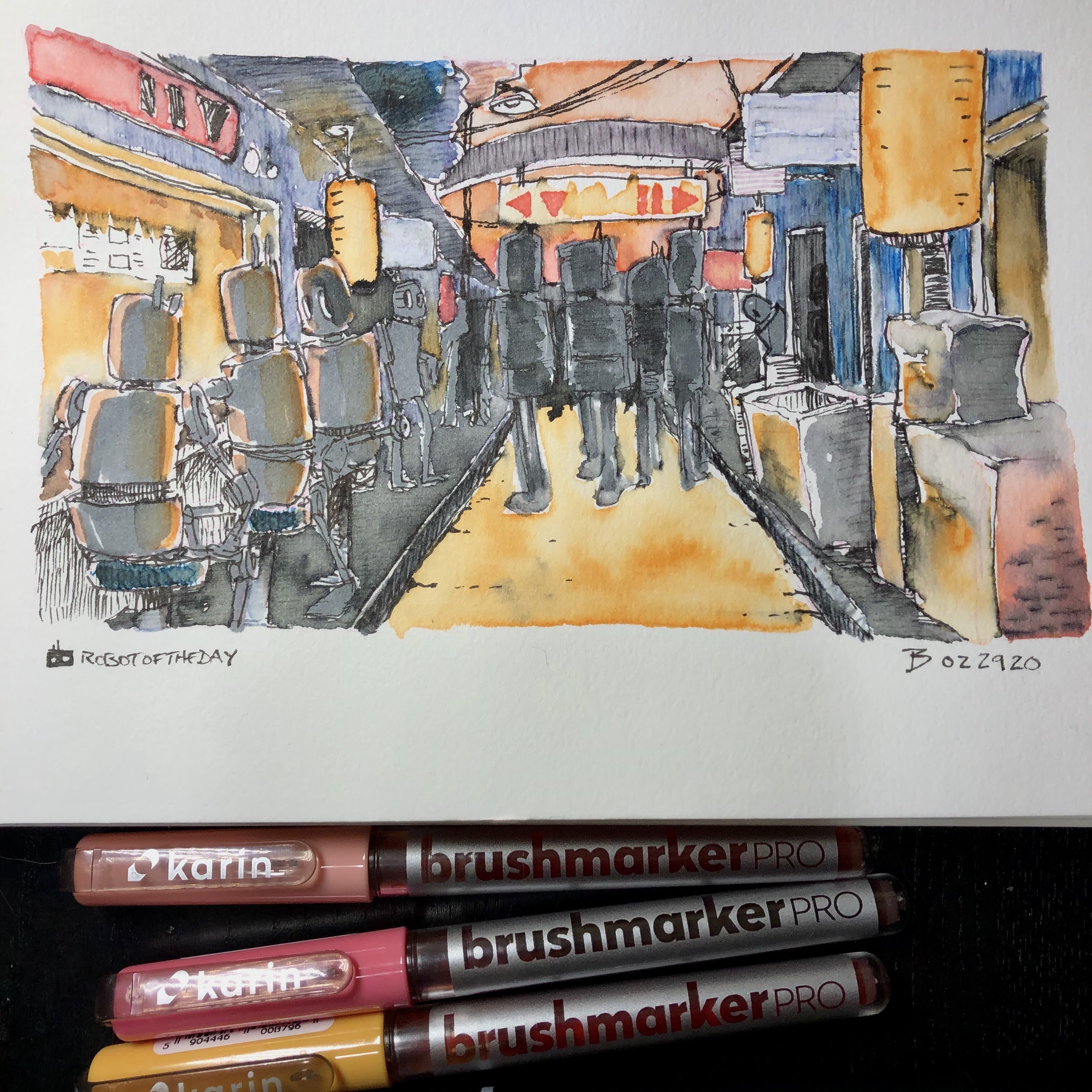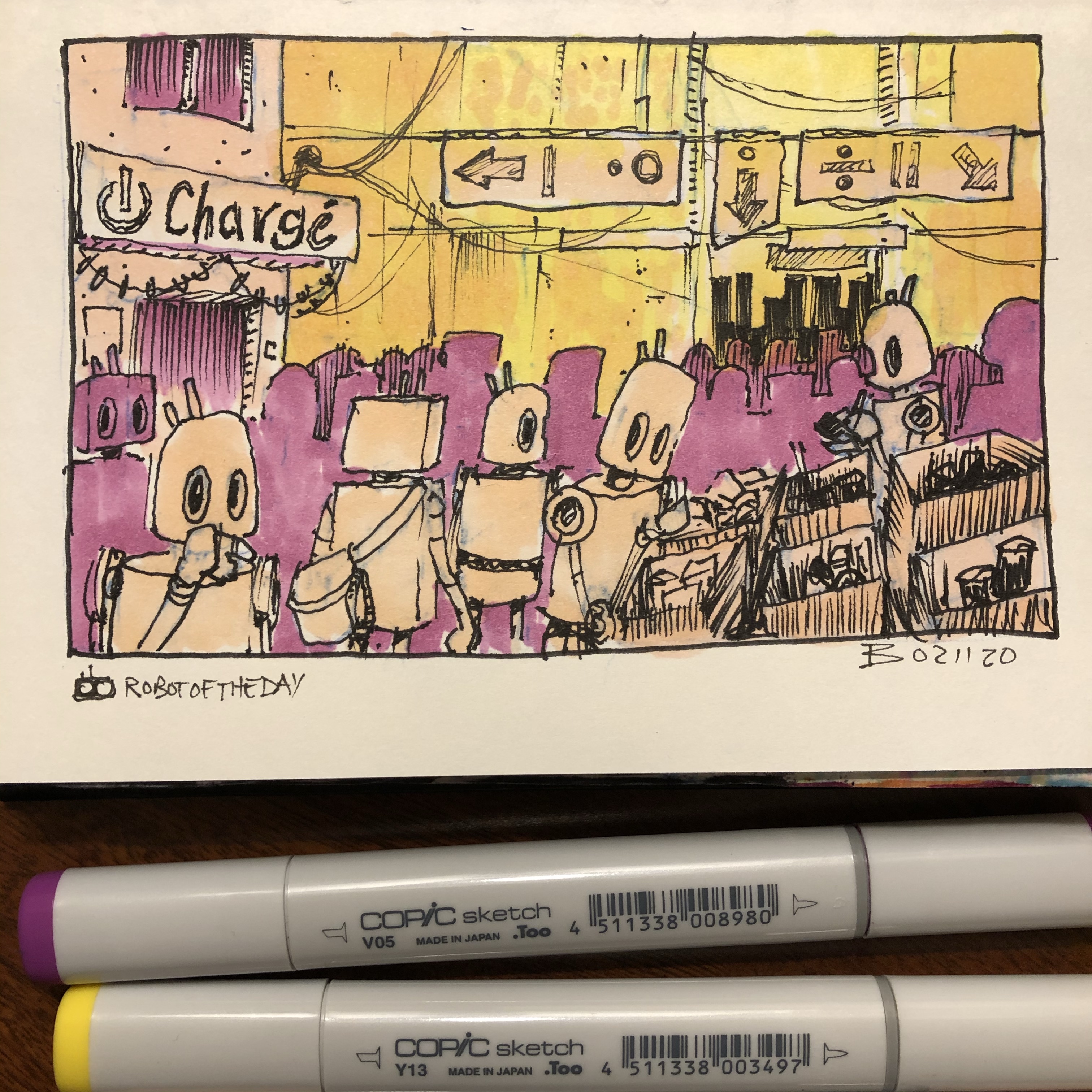 I was exploring the city outskirts by bike one afternoon when these two passed me going the other way, the plant’s leaves making quite a racket in the breeze. A while later I passed the plant nursery they must have been shopping at; the place was a hive of activity with robots moving between the rows of plants, stooping to inspect this one or that and others pushing carts laden with plants of various sizes.