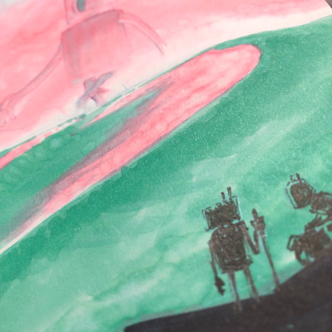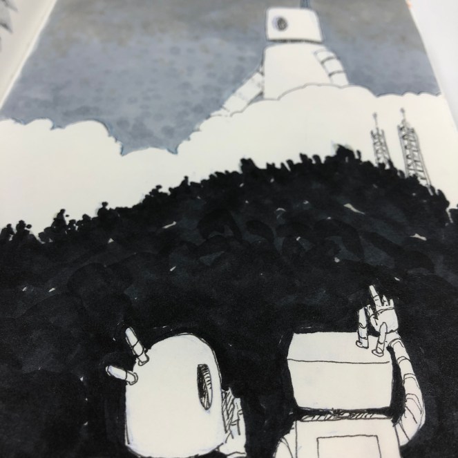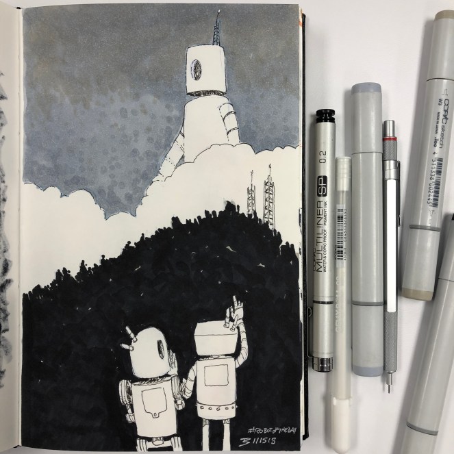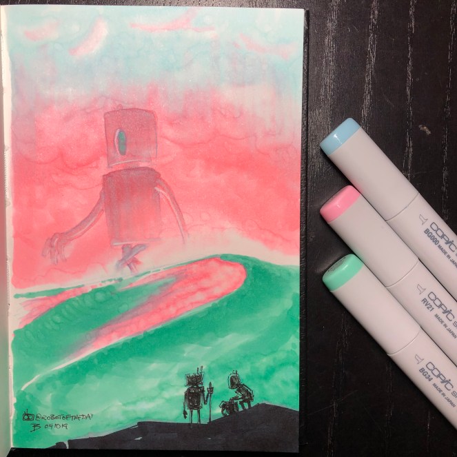 The robots were preparing to resume their journey, one waiting on the other to complete its rearrangement of its pack contents when they simultaneously spotted the giant looming over the far hilltop. A system test confirmed that this was legitimate input— not the result of noise, corrupt data, voltage irregularity, or similar malfunction.