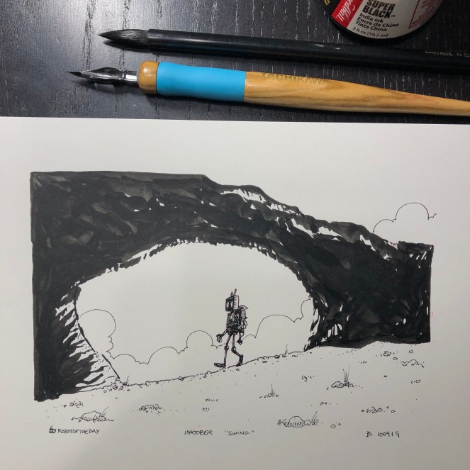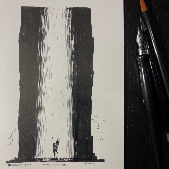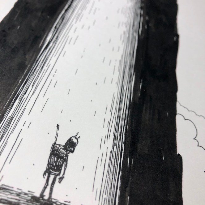 A storm darkened the sky early and forced the robot to take shelter in the derelict building over night. Before going to sleep mode, they spent some time exploring deeper into the structure, the lantern casting long shadows. The building was empty and devoid of anything of any interest— save for one wall. It was covered in strange, indecipherable markings and pictographs— the raw materials of legend and myth. The robot set their pack down and dig out a paper notebook and stylus. After recording some visual data they set about logging the find in the notebook— a failsafe storage mode. First the odd EMF spike and now this…
