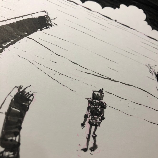 As the robot picked their way through a narrow passage between two rock faces the tower came into view; it was very close now, not more than another hour’s walk. As they carefully chose their footing, the robot spotted something glinting among the rocks and stopped to pick it up. A flat, square object with a delicate metal aperture along one side bearing the marking “2HD.” With a piece of string from their pack, the robot attached the object to their walking staff; an enigmatic ornament for a journey full of mystery.