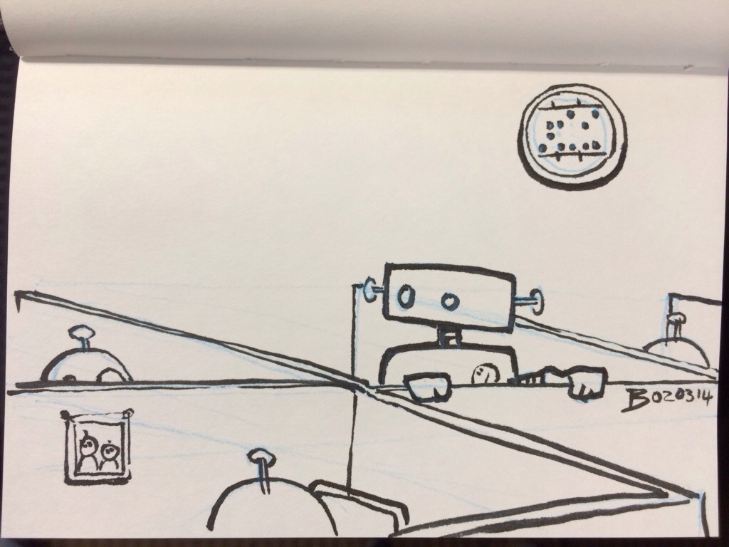 Development of the “Off1ce Dron3s” continues to be slow as focus is constantly drawn to preparing for upcoming events. That said, here are a few sketches of what The Automated Marketer might look like…