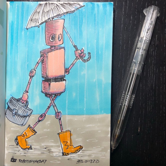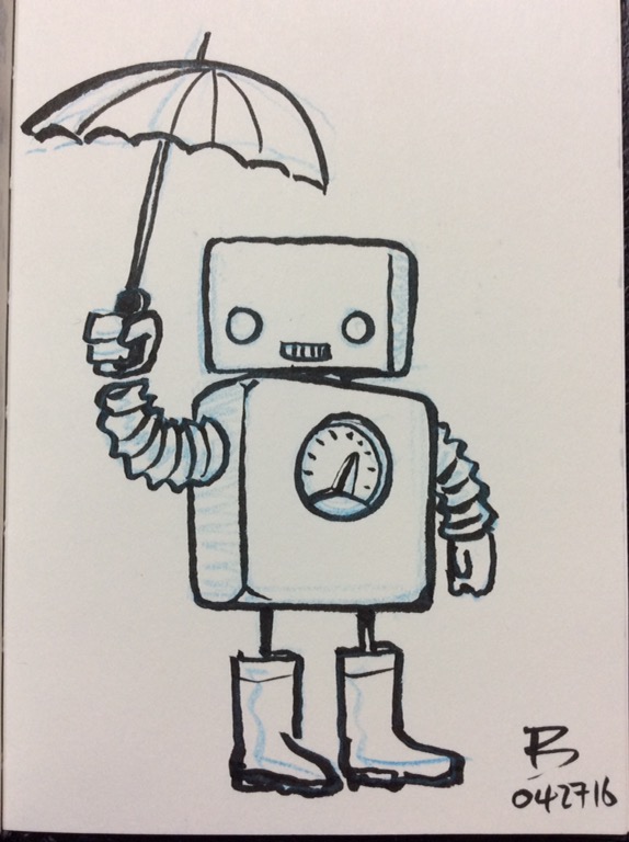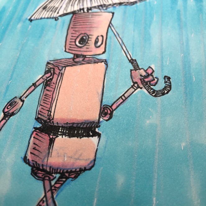 “Please draw something ‘gloomy.’” After a while I turned my sketchbook around, “How about this? Although I prefer to think of this as ‘atmospheric.’” The robot considered this for a moment. “The precipitation is simply thicker atmosphere and has no practical effect.” I countered “What if you have a defective seal?” The robot just stood there, offering no reply.