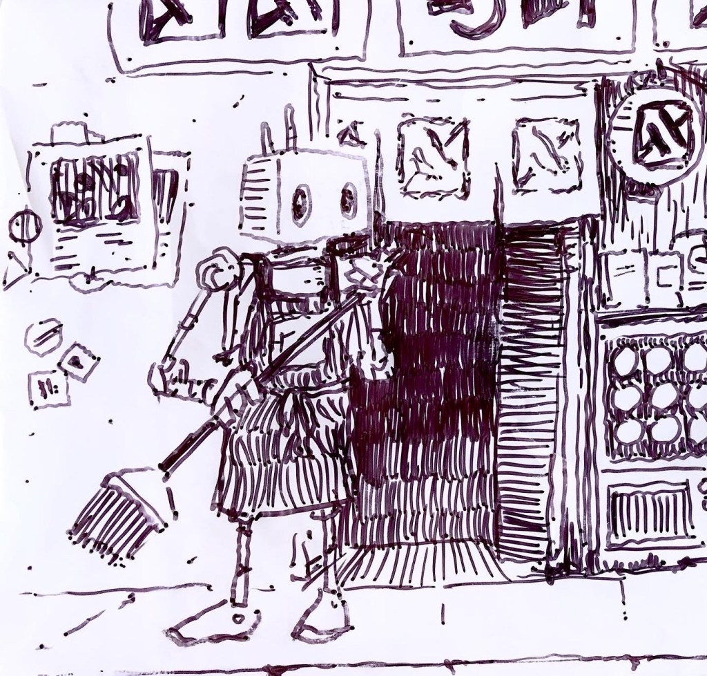 “Excuse me, cat, when you are ready I will need you to relocate so that I may sweep this area.” The cat made a few last swipes at its whiskers and then stood. It the ambled down the sidewalk a few meters, sat down, and continued grooming. “Thank you,” the robot said and began briskly sweeping the pavement. The cat looked up for a moment and then returned its attention to its ears. . I documented this scene on the back of a plastic bag given to me on a recent trip by a friendly robot concerned that I may experience some “bias instability or null error with my gyroscope.” (Barf??)