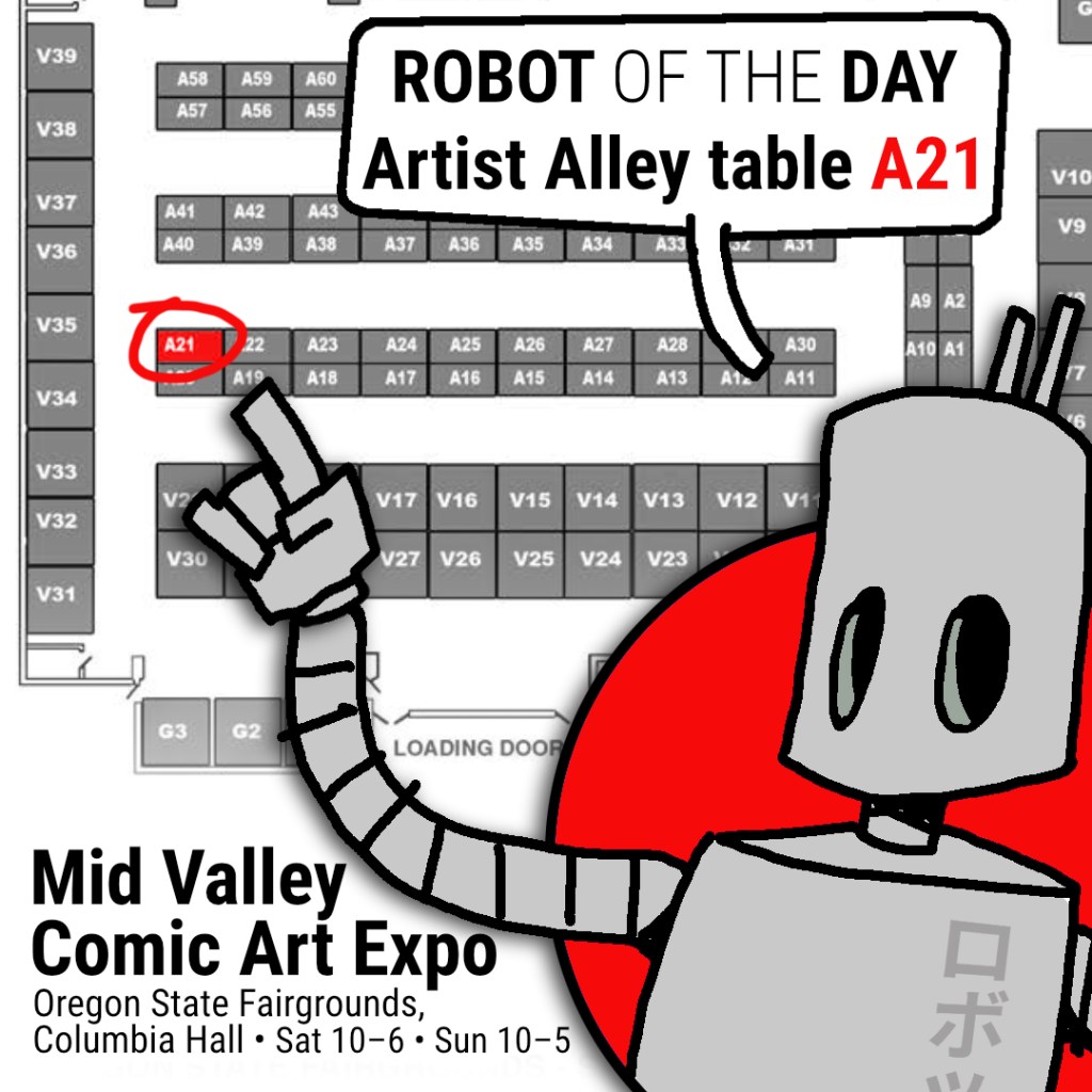 This weekend, June 3-4, 2023, the robots will be at the Mid Valley Comic Arts Expo in Salem, Oregon! Oregon State Fairgrounds, Columbia Hall, Saturday 10-6 and Sunday 10-5.