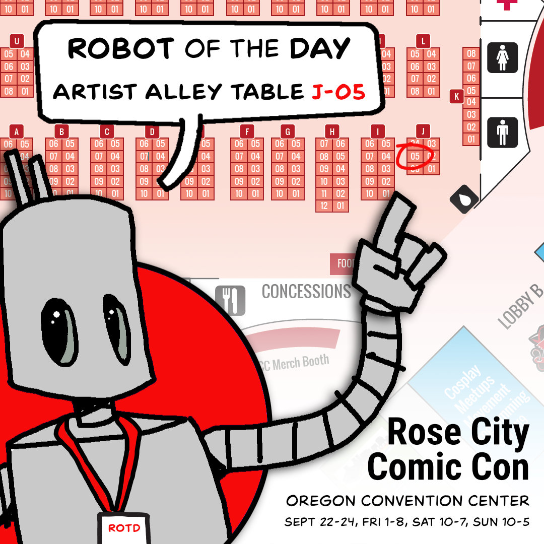 The robots will be in Artist Alley at table J-05. We’ll be there with new zines, stickers, art prints and more! Come say “beepboop!” (Robot catch-all term: hello, hi, whatever, yep, nope, that thing over there) Check out Rose City Comic Con’s sitefor tickets and more information.