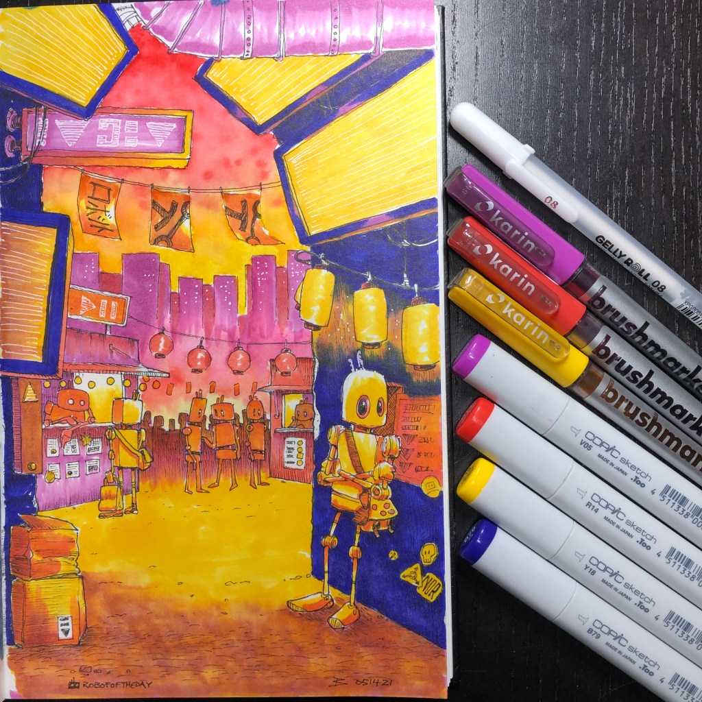 I spotted this brightly-colored robot across the street, a brief bubble of contemplation in the surrounding bustle of the market district. I know some robots employ temporary methods of decoration; it takes real commitment to go with anodizing dyes.