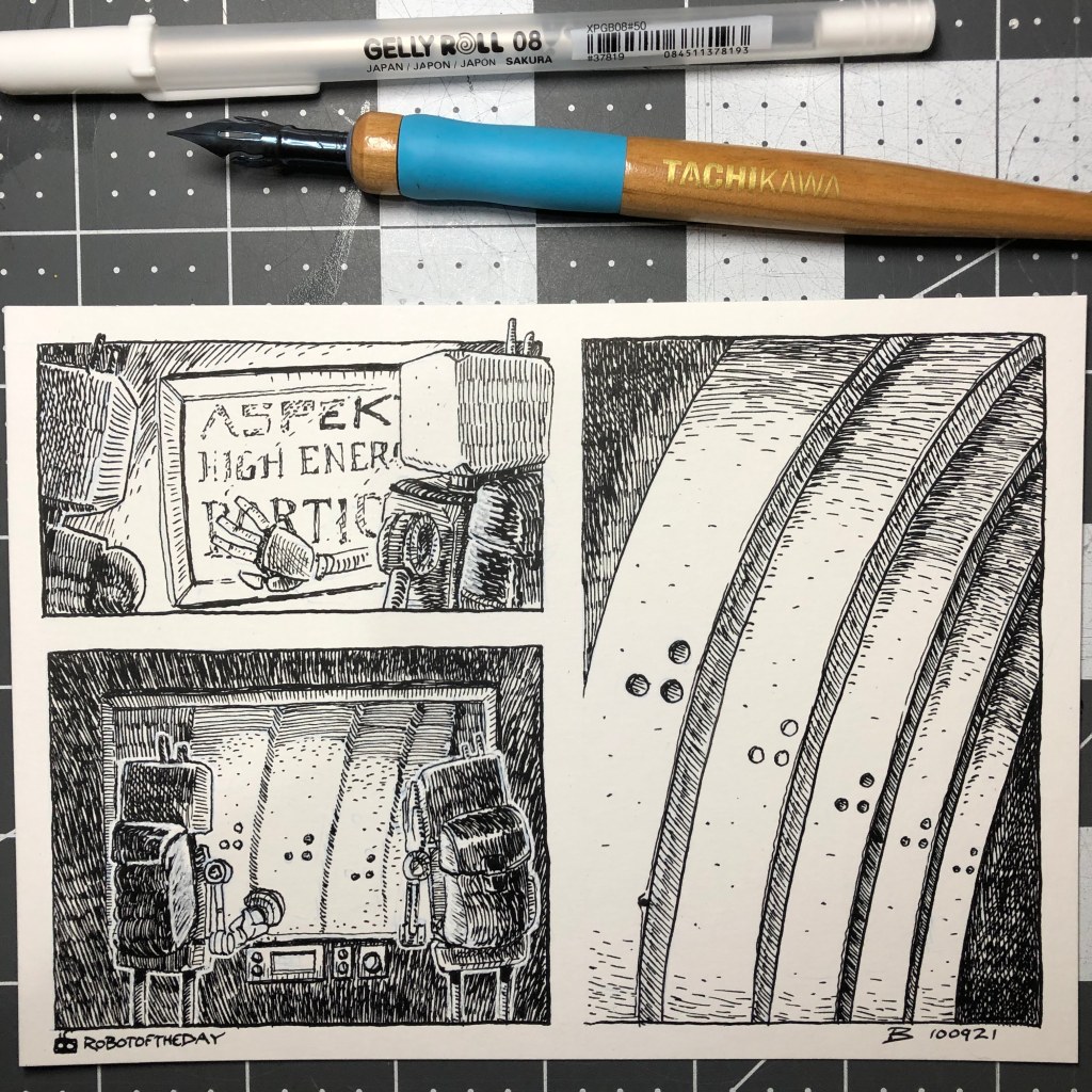 Hanging around outside a rechargé one evening and these two caught my eye. They appeared to be waiting with patience only robots seem to be able to muster. After a time I made a quick pencil sketch to document the scene. Eventually I began to rummage for an ink pen to proceed further when the third member of their party arrived (from an apparently unexpected vector) and all three proceeded to squeeze into the cab of this improbably tiny vehicle. After just a few moments of arranging themselves, the truck, cargo, and three robots hummed away from the curb and disappeared around the corner into the deepening twilight.