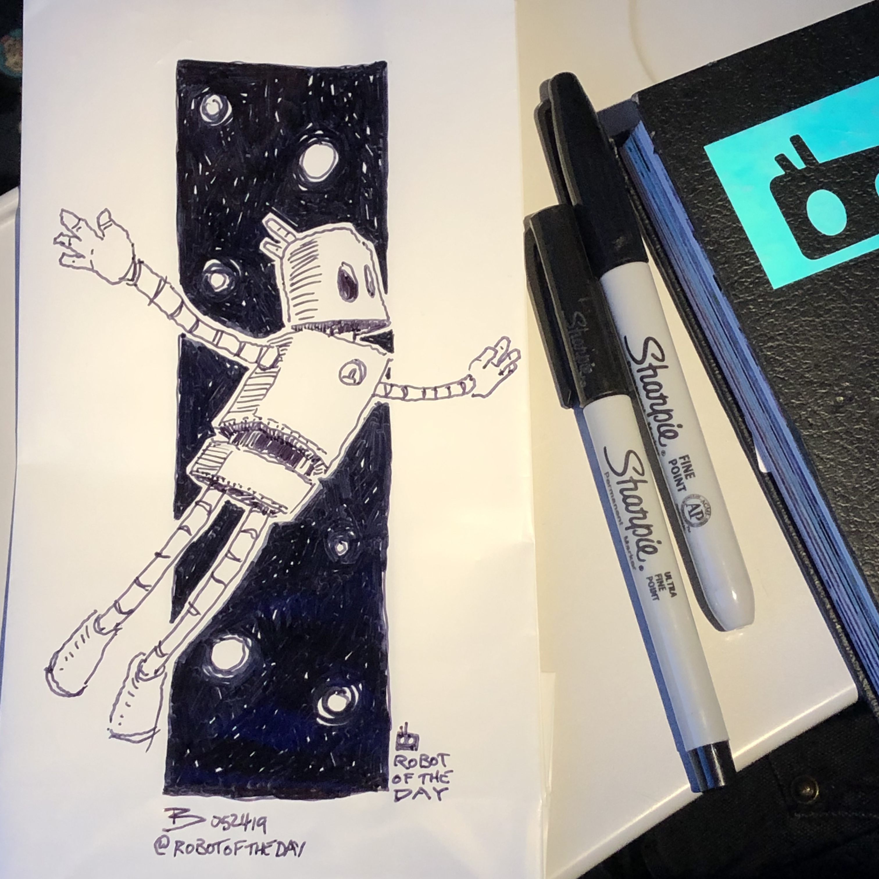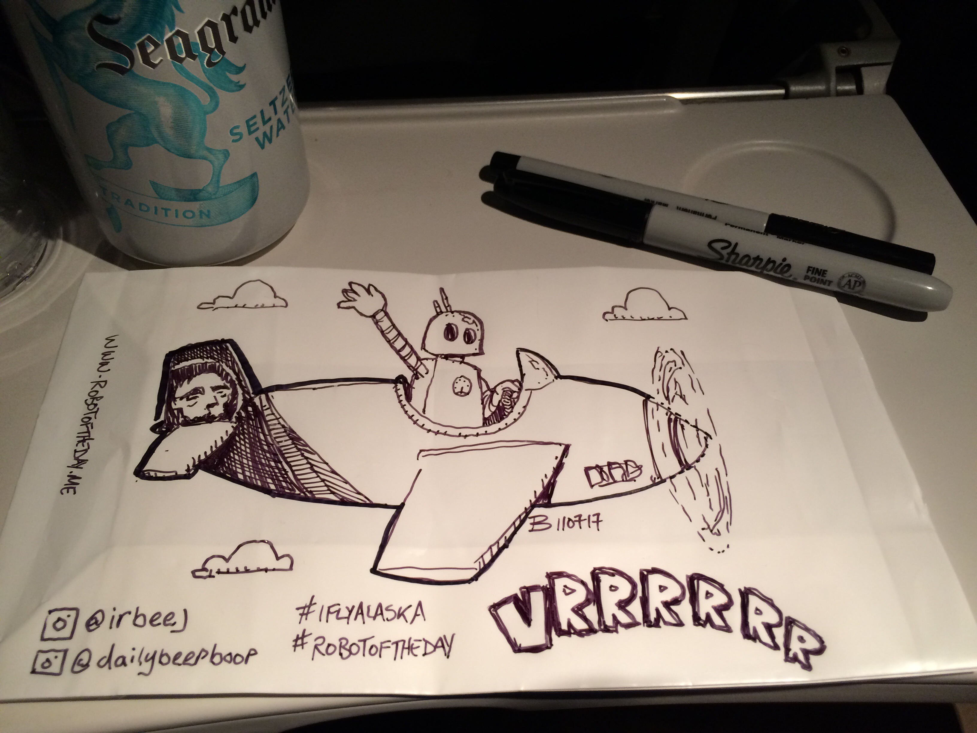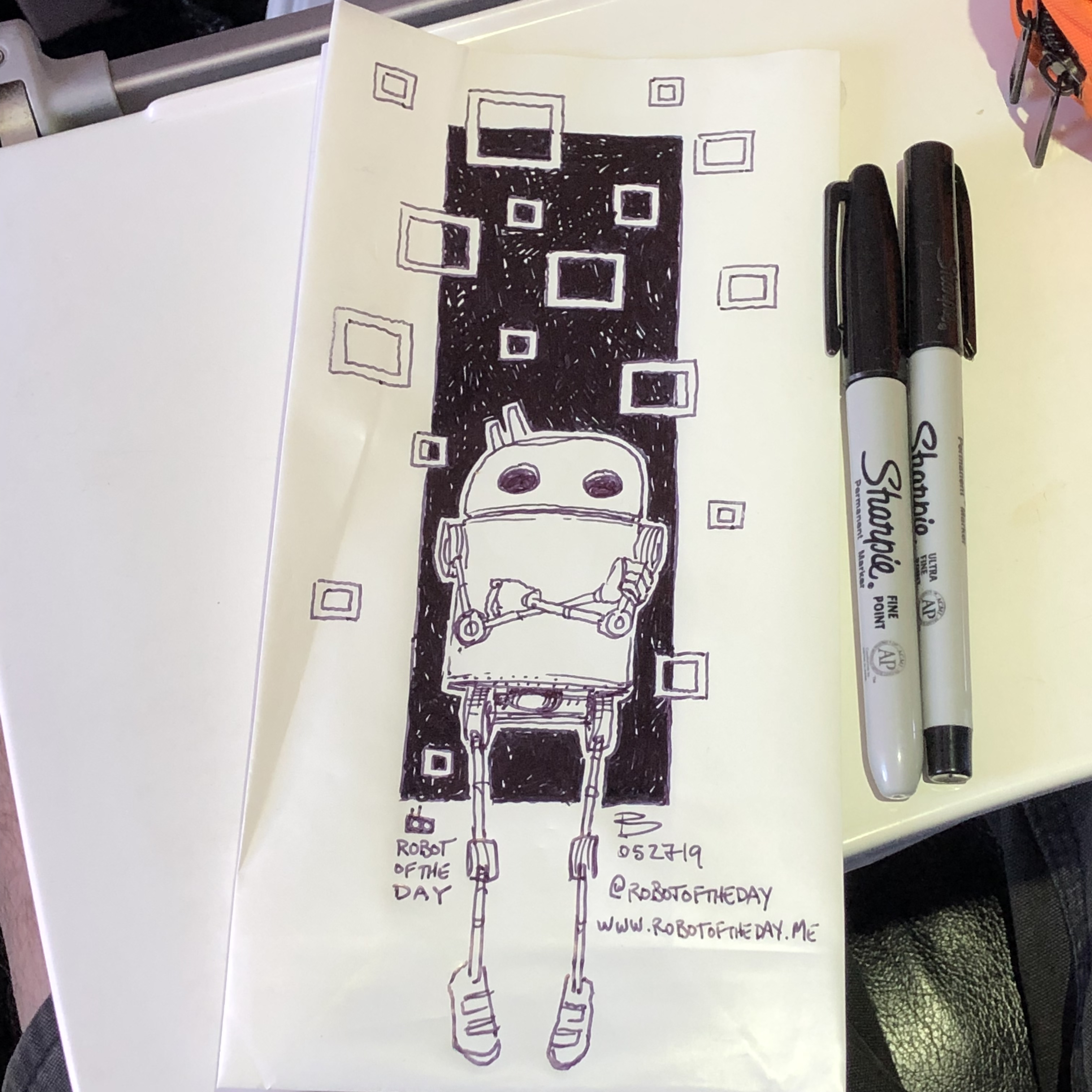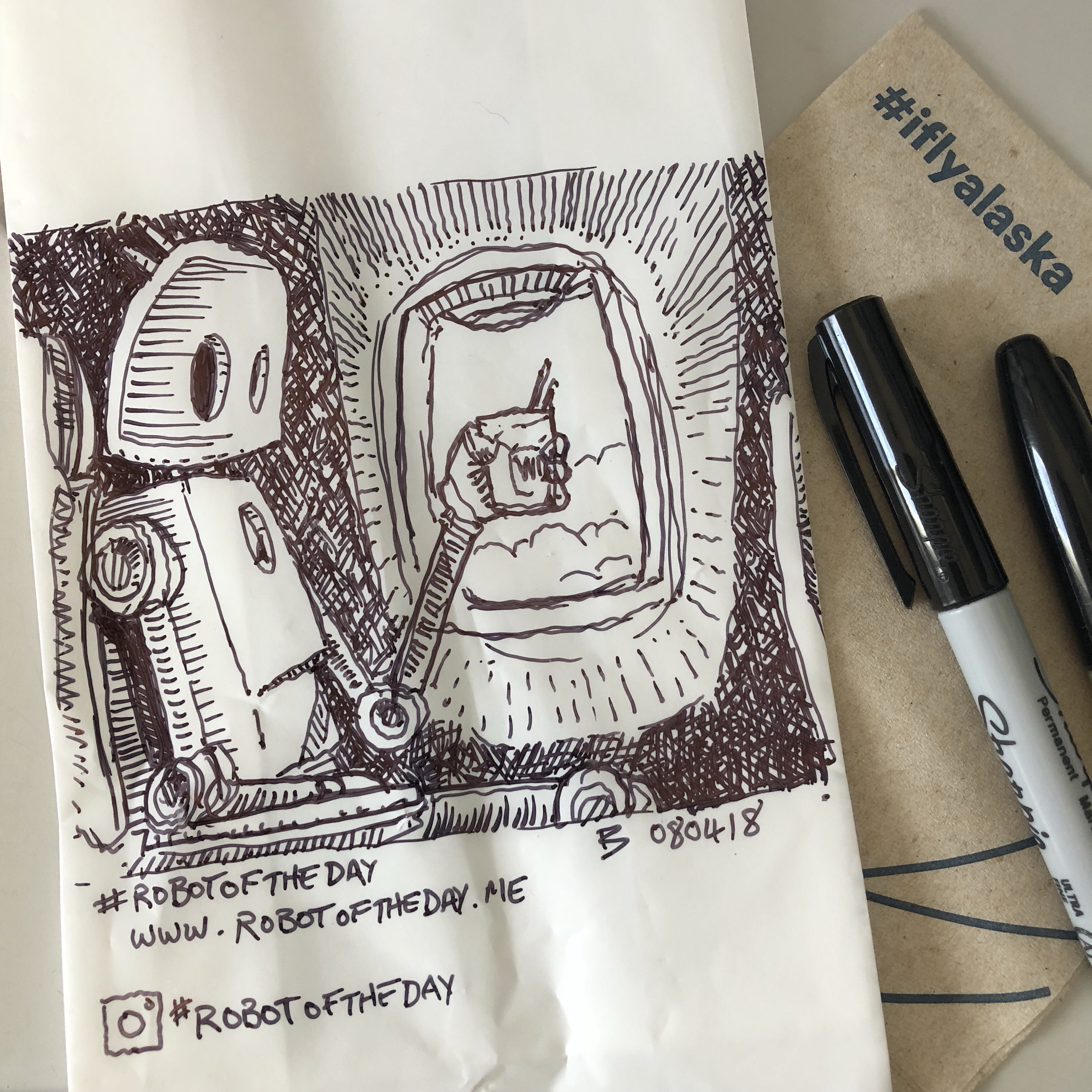 (Art drop at 35,000 feet) The robot sat in the seat next to met, without moving or making a sound, apparently taking a few idle cycles to access random sectors of memory and review their contents. We were both experiencing the movement of electrons across circuits.