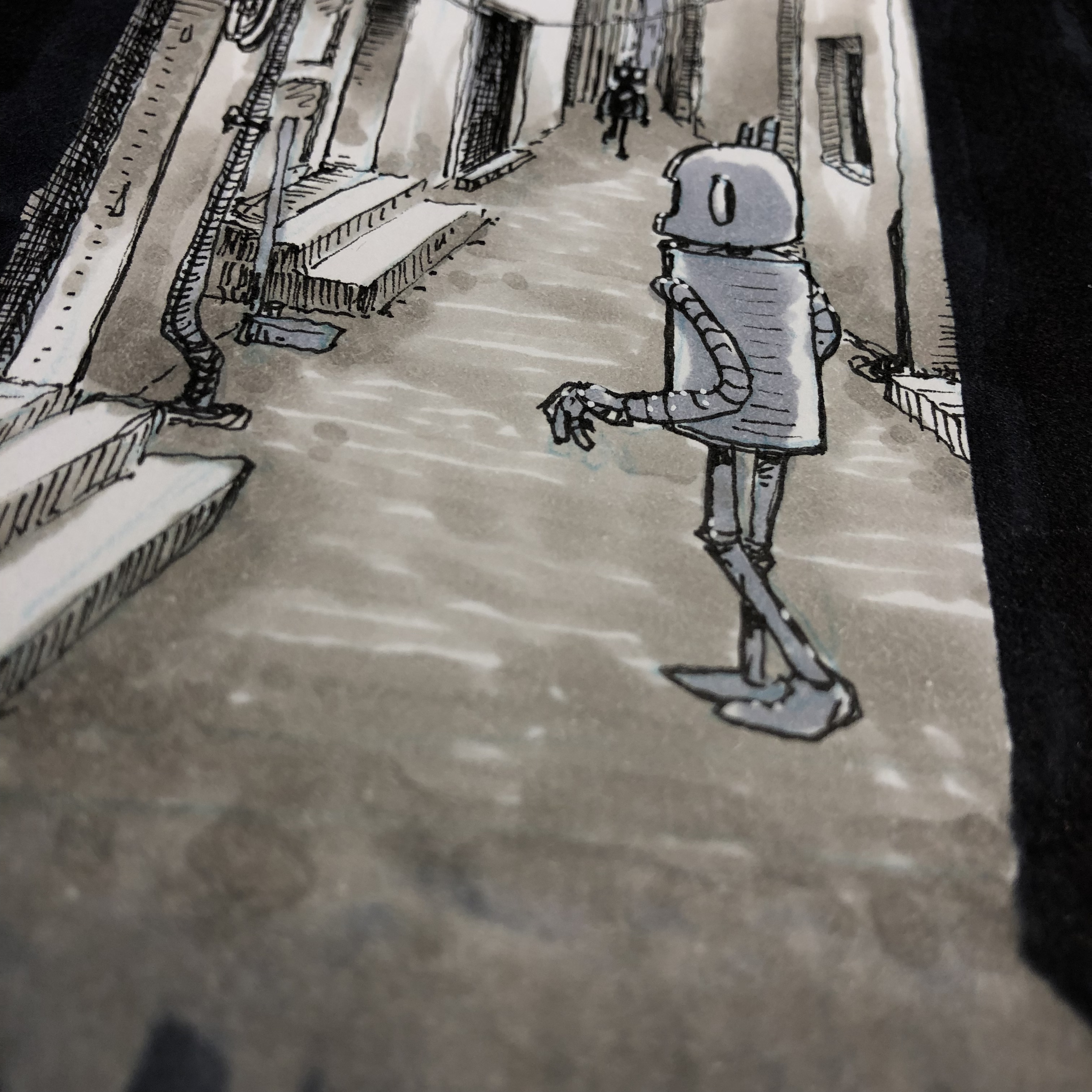 The robots never “sleep” for lengthy periods of time; this makes wandering their cities both endlessly fascinating and exhausting. I am especially drawn to these crowded alleys: they are always buzzing with all manner of activity and always in a state of perpetual dusk.