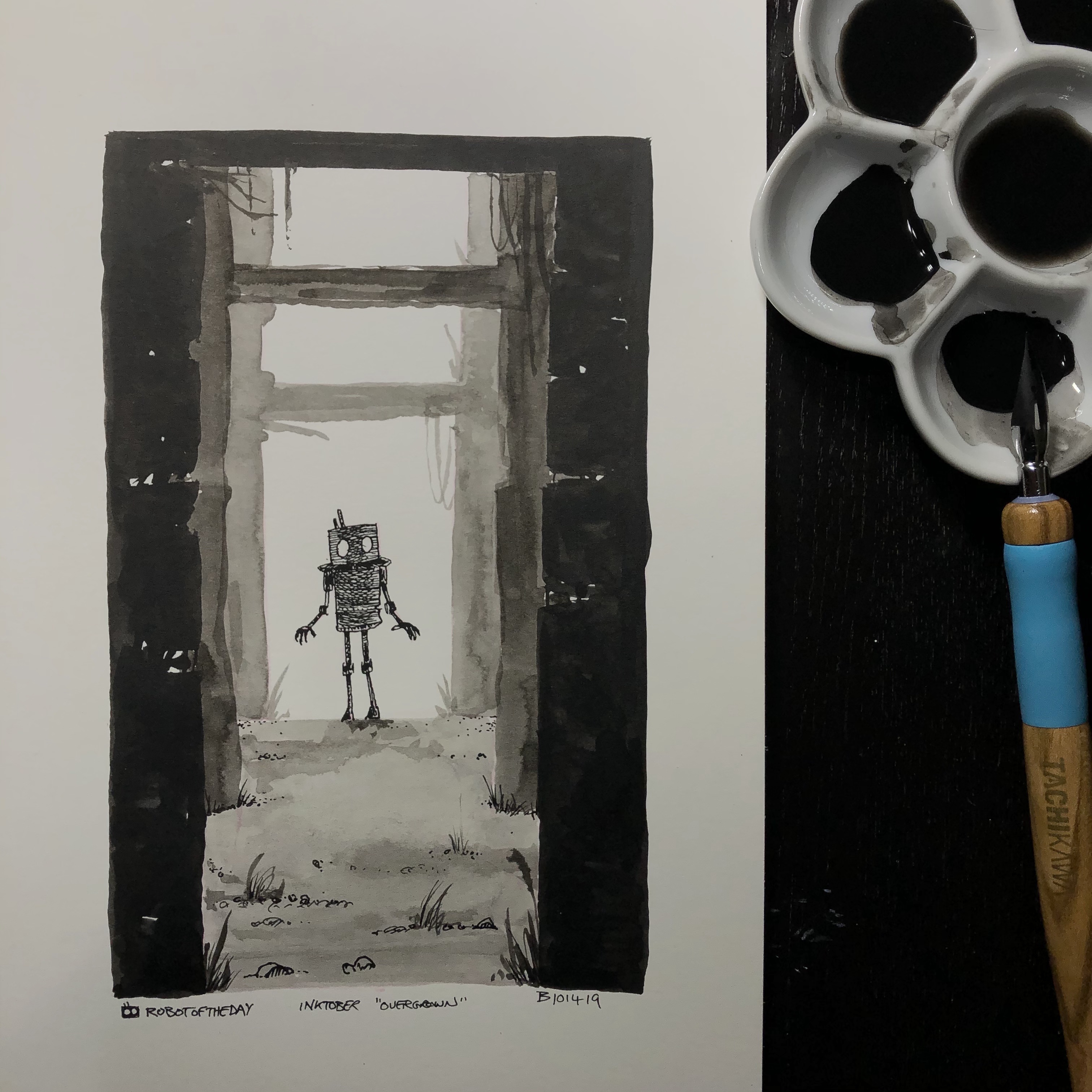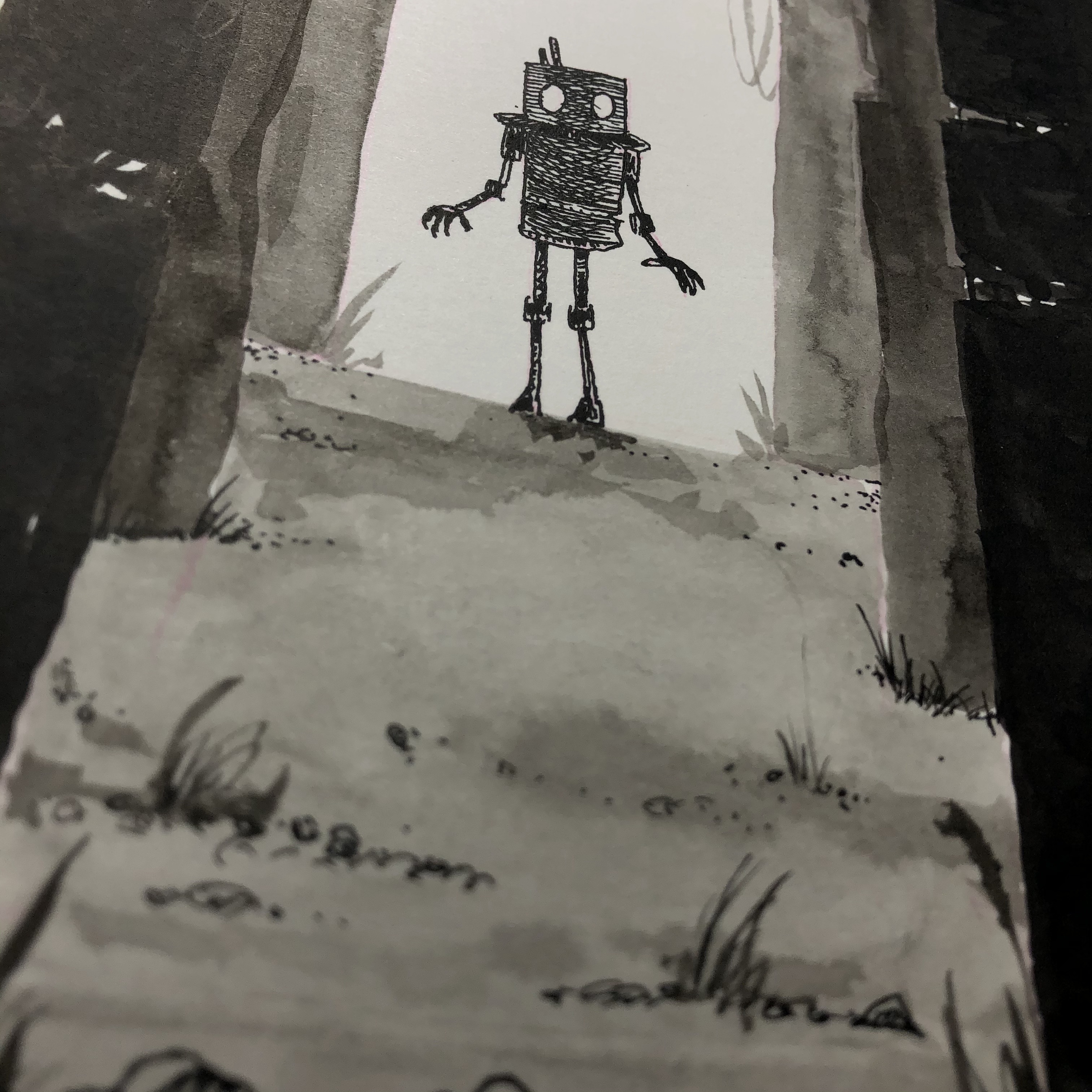 After a few days of travel, the robot encountered an oddly designed structure, overgrown with tenacious weeds and shadows. They had been monitoring low-level background EMF noise for the past day and moments after stepping inside the structure there was a tremendous spike in the energy level. Logging the event for investigation later, the robot proceeded to walk deeper into the structure…